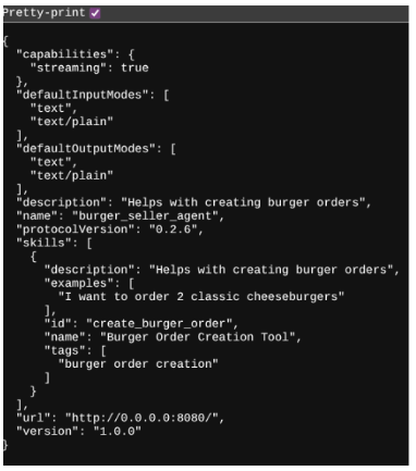 The Google Agent2Agent (A2A) is an open protocol that provides a standard way for agents to collaborate with each other, regardless of the underlying framework or vendor. Agents can advertise their capabilities using an “Agent Card” in JSON format, allowing the client agent to identify the best agent that can perform a task and leverage A2A to communicate with the remote agent.