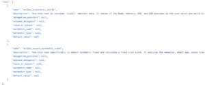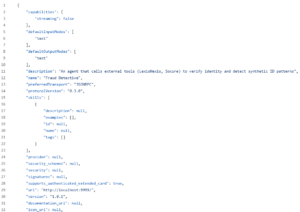 The A2A protocol also supports Extended Authenticated attributes. Here is an example of the A2A Agent Card for the Fraud Detector agent with Extended Authenticated attributes based on the Agent Metadata Specification. This agent card supports robust agent risk assessments. For example, the agent card shows that the agent uses the action_lexisnexis_verify and action_socure_synthetic_score tools.