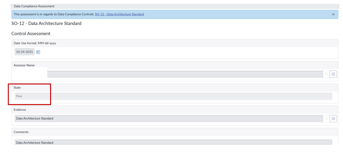 As stated above, the testing frequency for the control is on an annual basis. On an annual basis, the control owner implements a Data Compliance Assessment in Tavro. The control is in the Pass state based on the uploaded evidence in the form of the actual Data Architecture Standard.